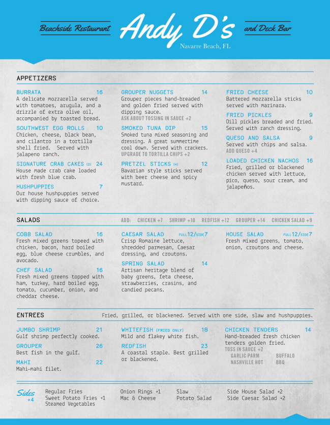 Welcome to Andy D's Beachside Restaurant & Deck Bar, an inviting culinary gem located at 8649 Gulf Blvd, Navarre, FL 32566. With the soothing sound of waves and the vibrant atmosphere of live music, this restaurant is an ideal spot to enjoy a meal after a day at the beach. Whether you’re on vacation or a local, Andy D's offers a delightful blend of hearty comfort food and coastal breeziness that keeps guests returning year after year.